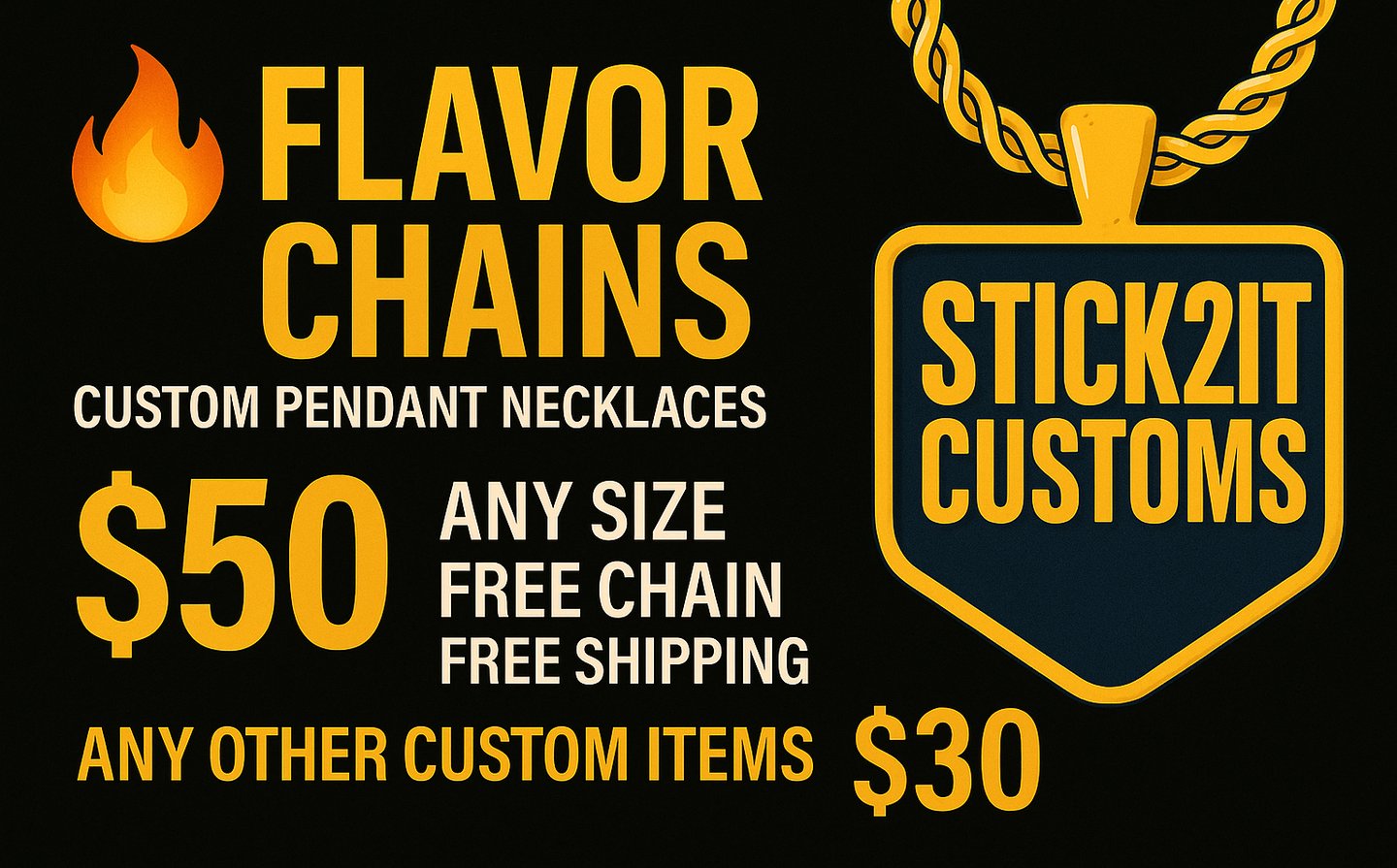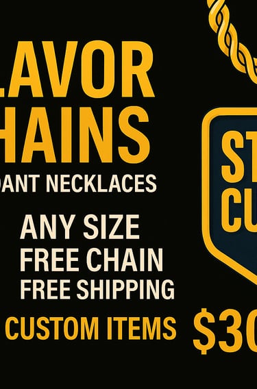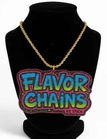 All Flavor Chains shown are custom-made. Pick a design or send your own image/logo to stick2it2025@gmail.com for your custom pendant.